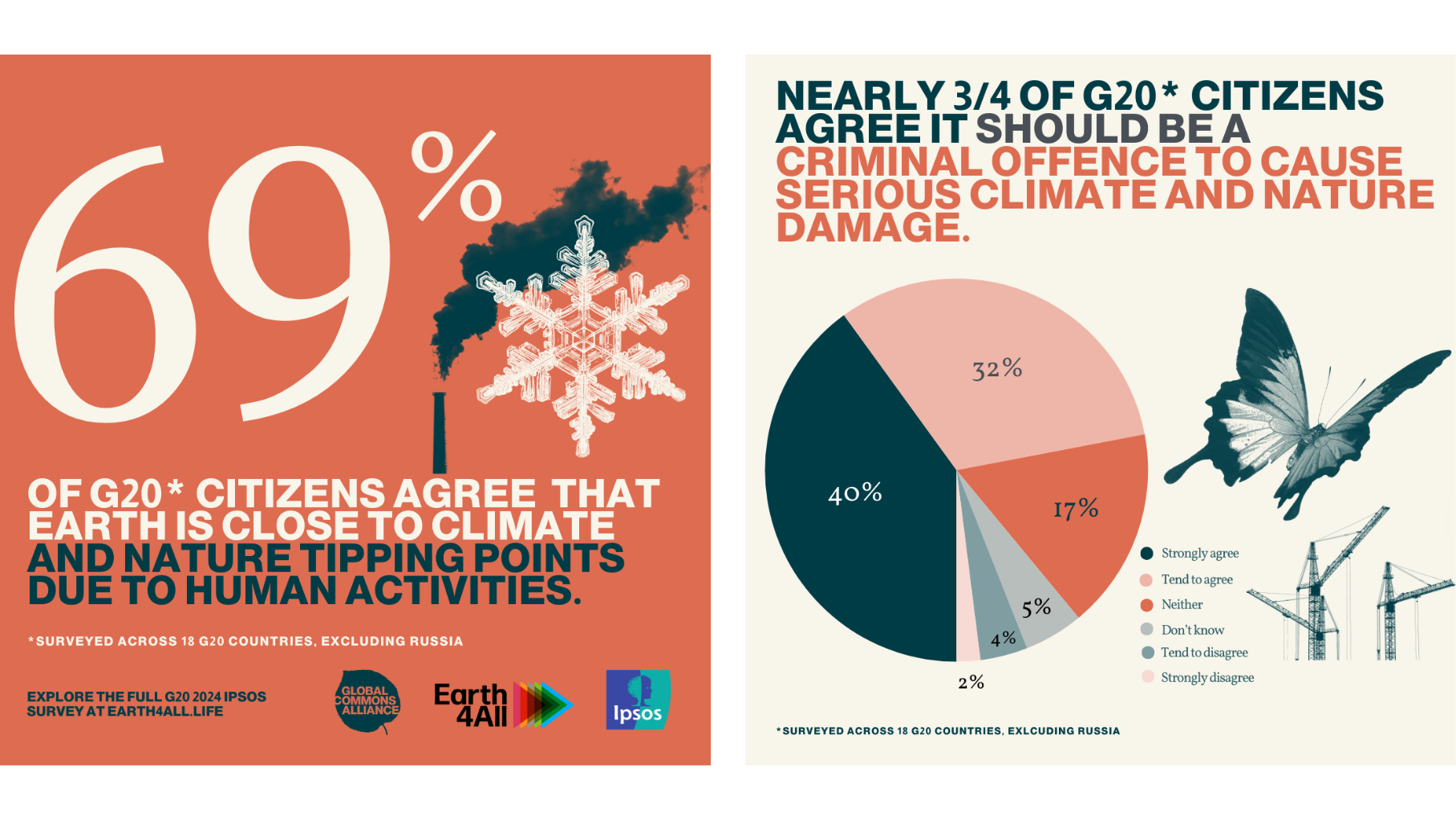 • Released during a mammoth year for elections globally, these results helped inform the political debate as we sought to ensure nationally relevant data reached the right people at the right time. The G20 surveys showed that a majority of people believe Earth is close to climate and nature tipping points. People agree that approving or permitting actions which cause serious damage to nature and the climate should be a criminal offence. The wealth of data from the surveys continues to be referenced in various campaigns and articles today.